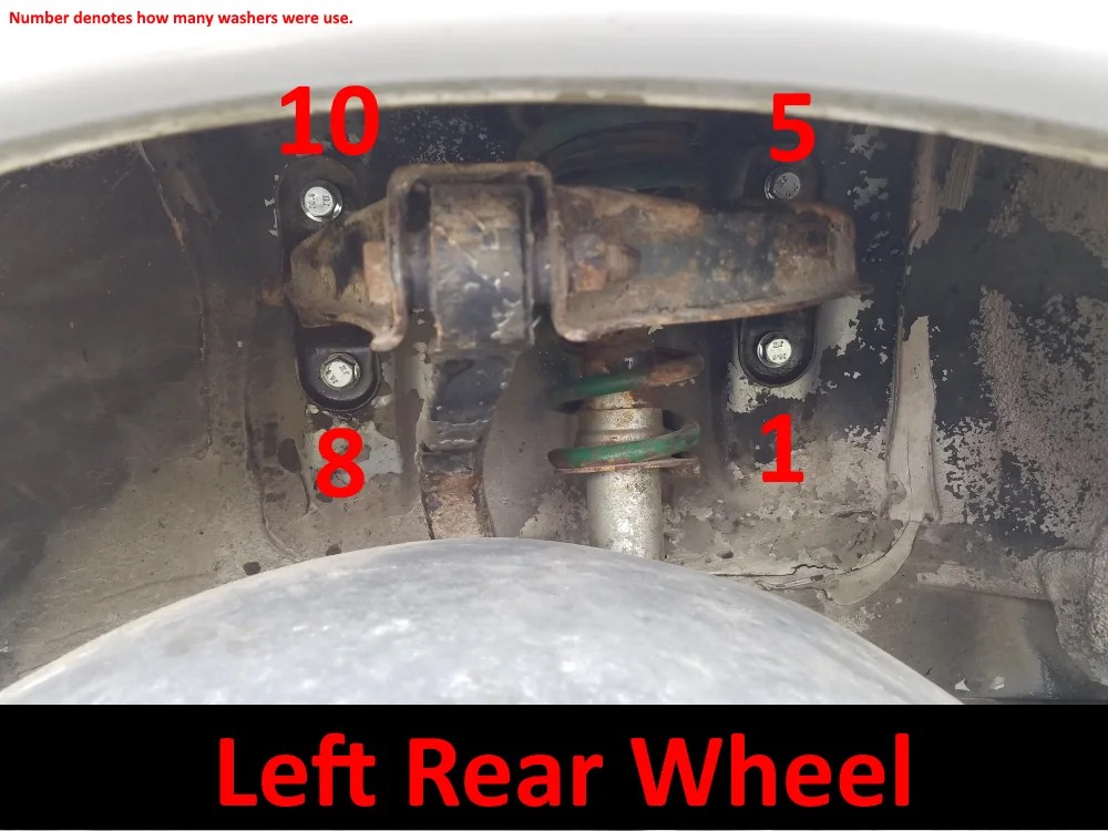 If you have a lot of negative camber in toe-in, then you will need to apply more washers between the top two bolts, and the lower bolt that is closer to the front of the car. This will tip the top of the wheel out and tip the front of the wheel out. Generally, you don’t apply any at all to the other lower bolt or maybe one washer if any at all.Â
