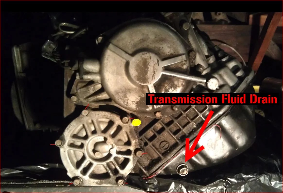 The picture shows the plugs to remove and drain the old fluid. It is recommended to do this every 30K miles along with the filter. It would be good practice to change it around 20K or you are already working with the transmission. Remove the two plugs and let it drain. The one on the pan is 17mm and the other is 24mm (I think).