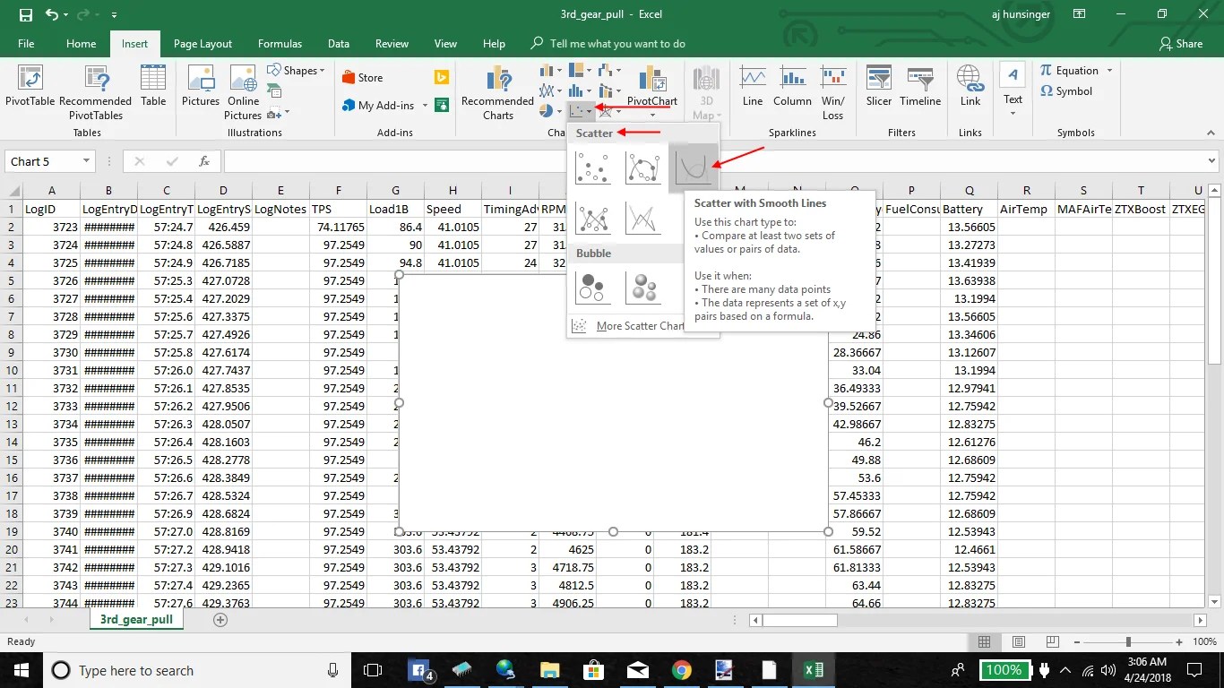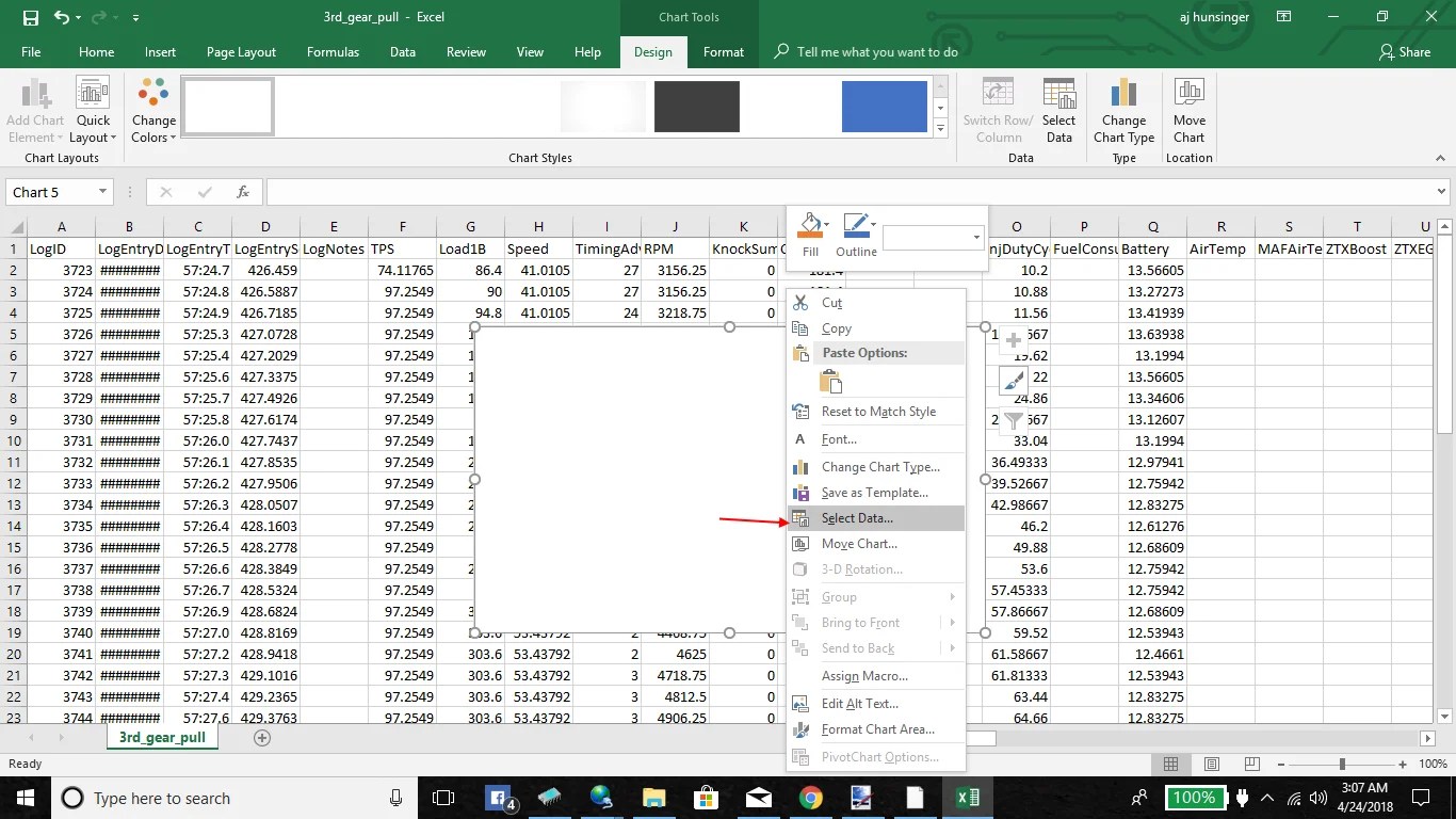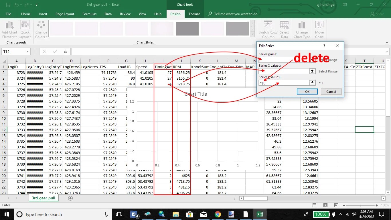 In the second box, highlight all of the cells with the RPM in it. You will highlight every RPM cell on the WOT, single gear pull. So from the time you hit full throttle till the end where you let off the throttle.