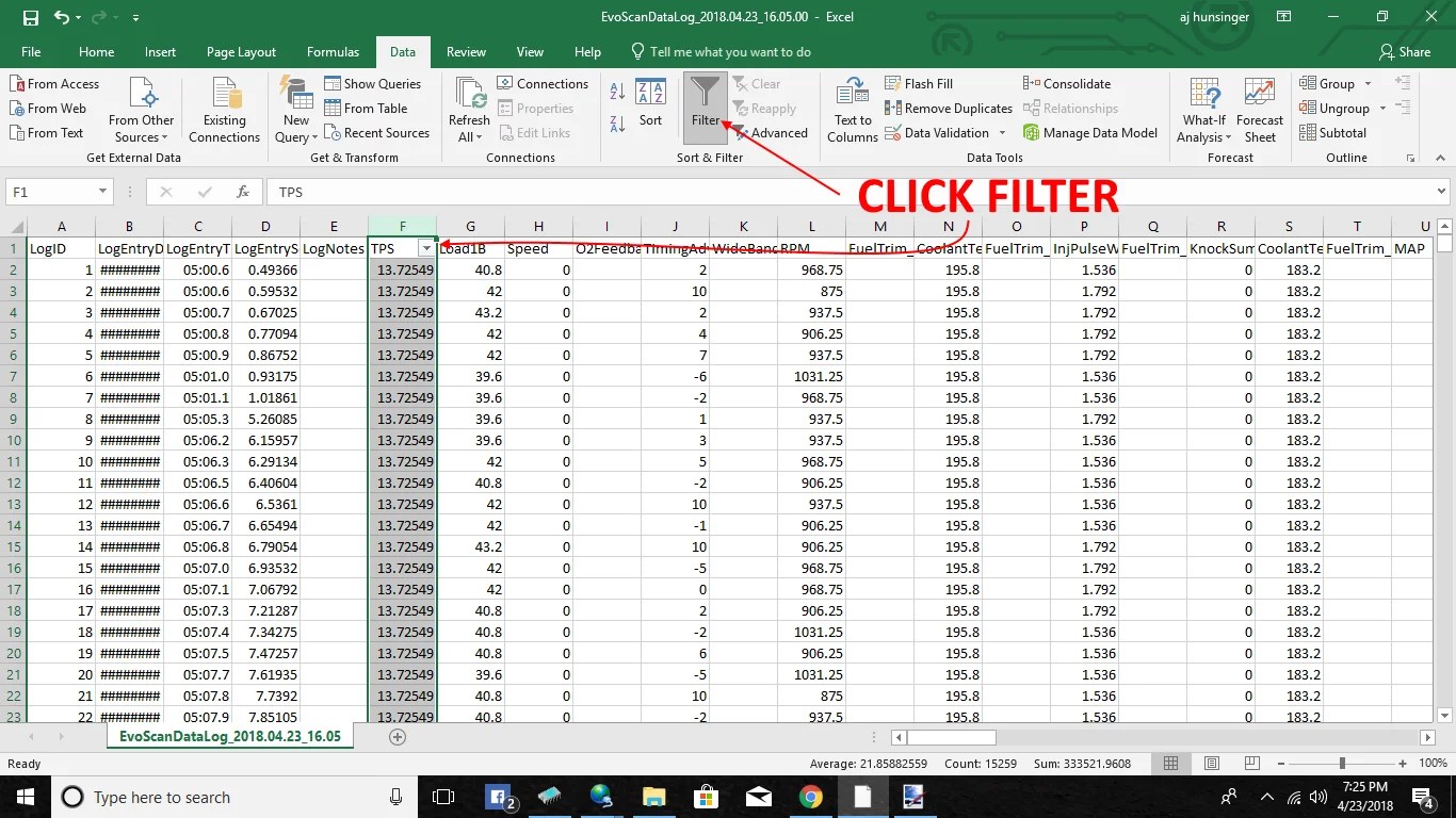 Finding that one WOT pull you did in one 30 minute log can be time consuming if you are going about it in the least logical way. Instead of scrolling down through until you see your TPS at 100% (which means WOT), you can Filter the TPS column.