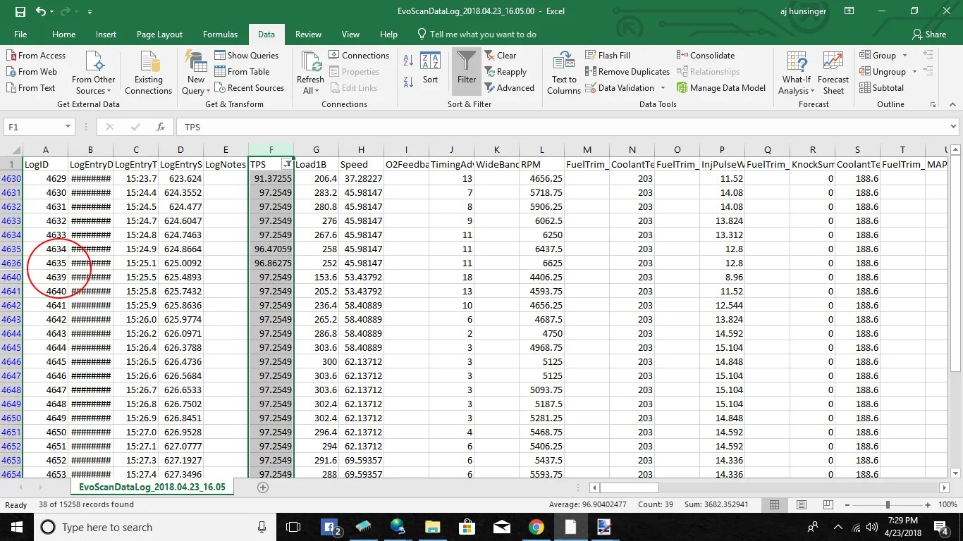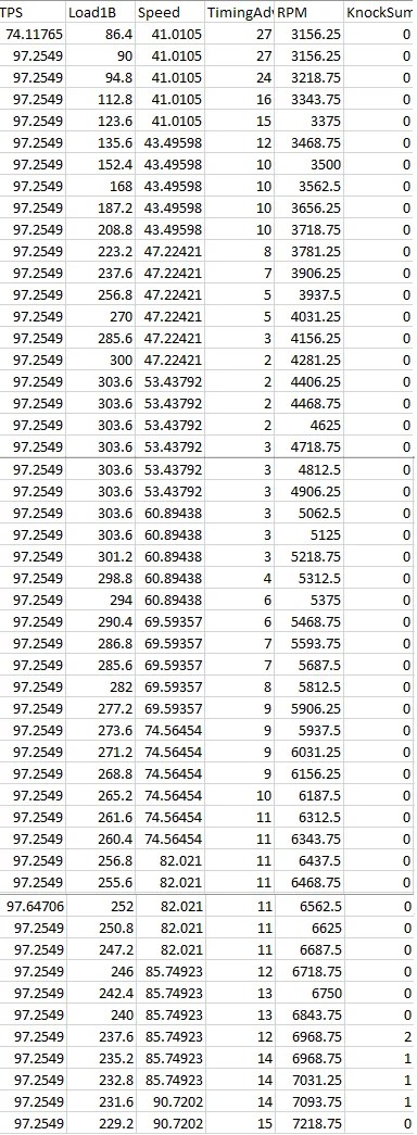 Step 4-Â Now, all of your WOT pulls in this log will rise to the top. Take notice when the LogID column seems to skip cells. The cells that are missing are the cells where you lifted off the throttle to make a shift. This also means that this is two separate gear pulls done back to back. For example, you are doing a 2nd gear pull, then shift to third, then do a third gear pull.