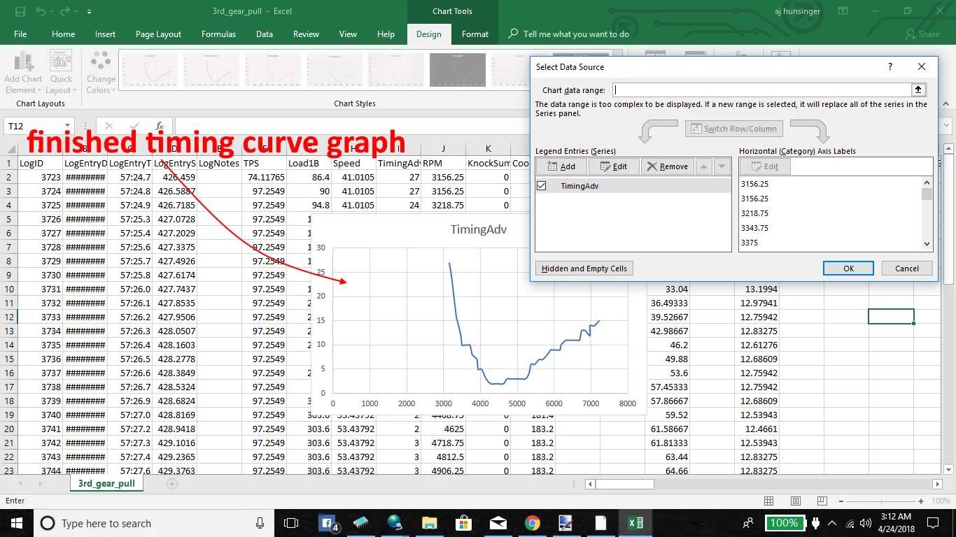 I spend the majority of my time tuning within the ignition maps. I am always trying to get the most timing I possibly can to crank out the most power in my car, and do so without getting knock. It can get really time consuming, real quick. Something that I like to put together is a timing curve graph. Basically, in Microsoft Excel, I create a Scatter Line Graph to show the ignition timing curve throughout one single gear pull/RPM range.