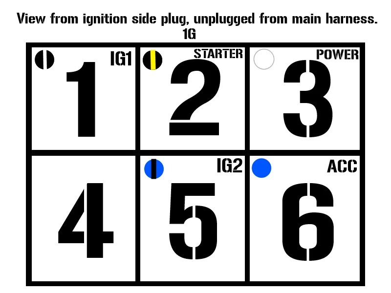 - PIN 6- Accessory: This wire powers all other accessories in the vehicle like radio, windows, doors, etc. (blue wire in 1G)