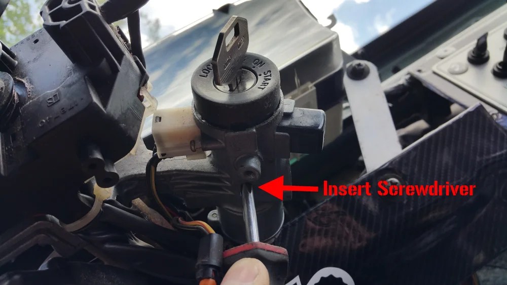 Next, locate the hole in the bottom, near the hole the screw was in. This is your locking pin hole. With your key in, turn the key to the ON position. Then, stick a screwdriver into the locking pin hole and pull the key out. The key will come out with the entire key cylinder. If you find that the key and cylinder will not come out, try turning the key to the ACC position.