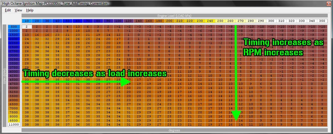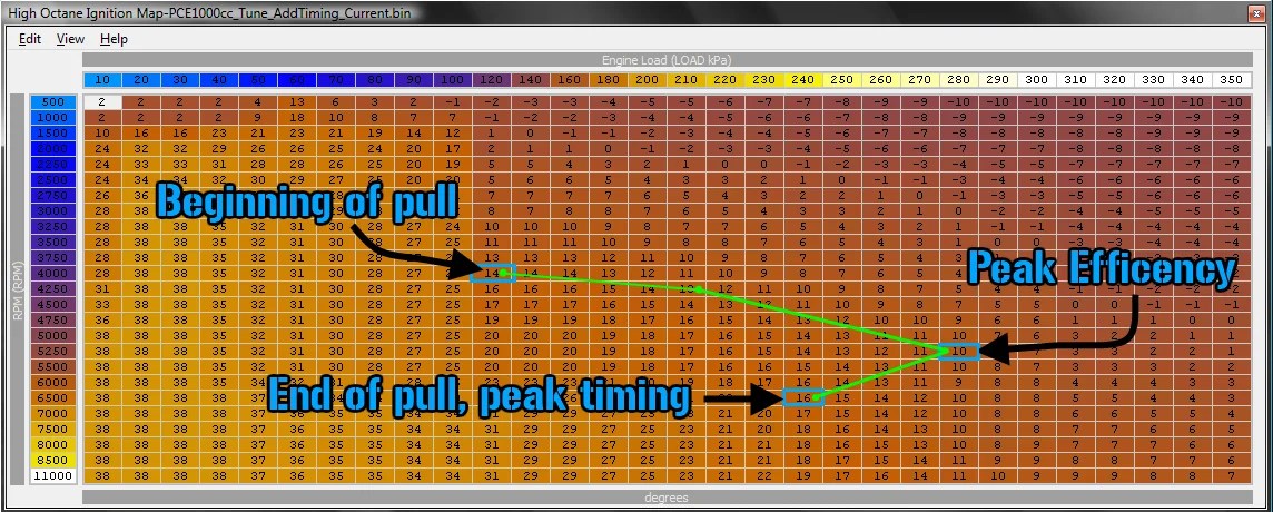 Getting back to the peak efficiency thing, again, you want your peak efficiency to be at the lowest timing level during a WOT pull. Further more, you want anything to the right of your peak efficiency cell have lower timing.