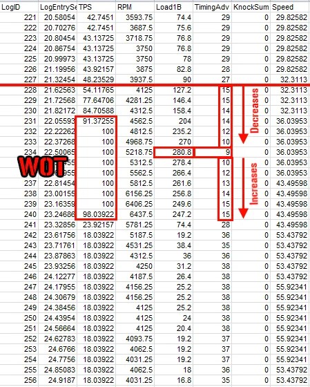 Every pull is different. In the log pictured above, my peak timing was only 15*. But, I let off at 6400RPM. When I go higher with RPM in a WOT pull, say 7000RPM, I am generally around 17-18*. The more RPM you turn throughout a WOT pull (after peak efficiency), the more timing you will reach. If you begin knocking in higher RPM, closer to where you want to shift at, you need to lower peak timing.Â